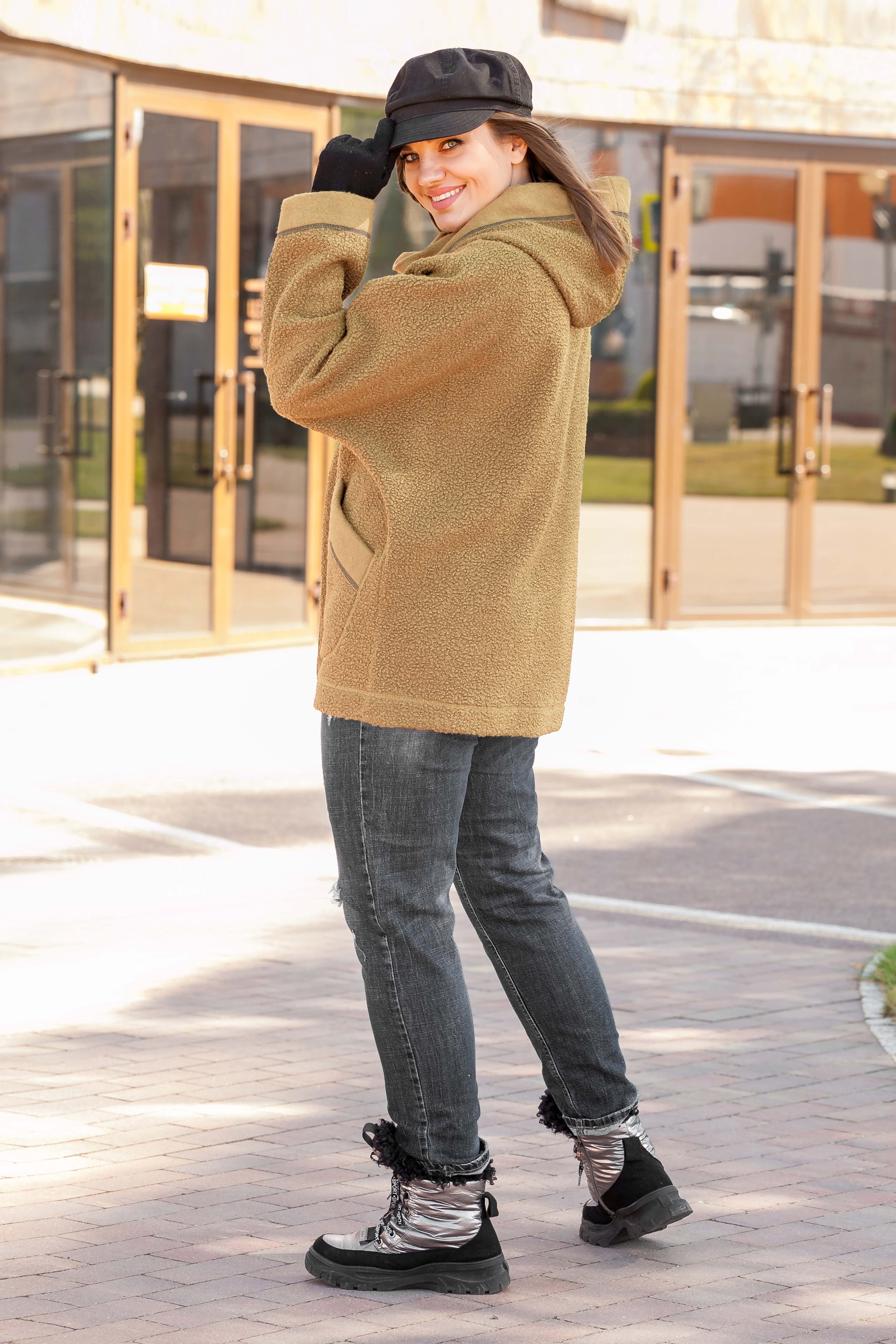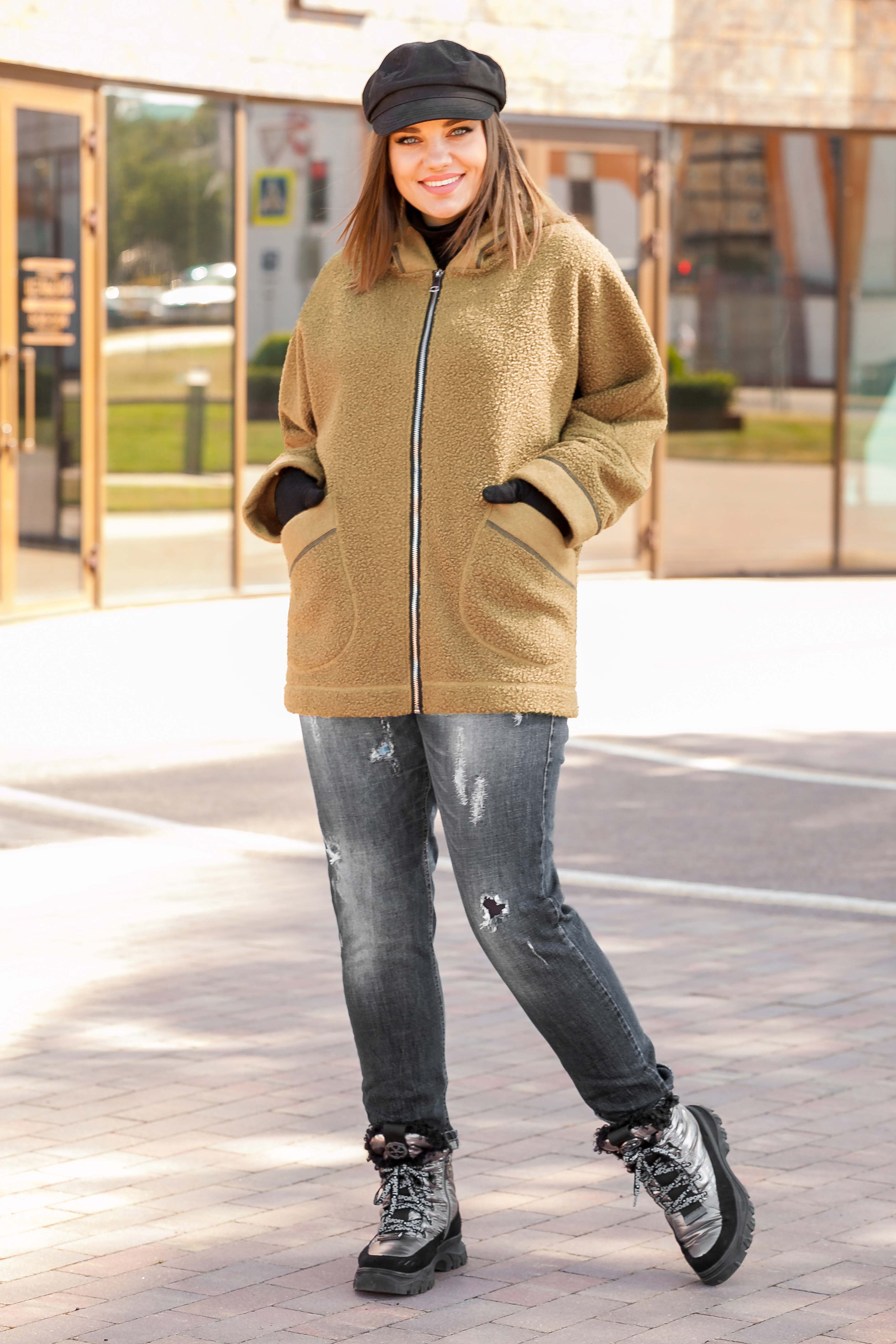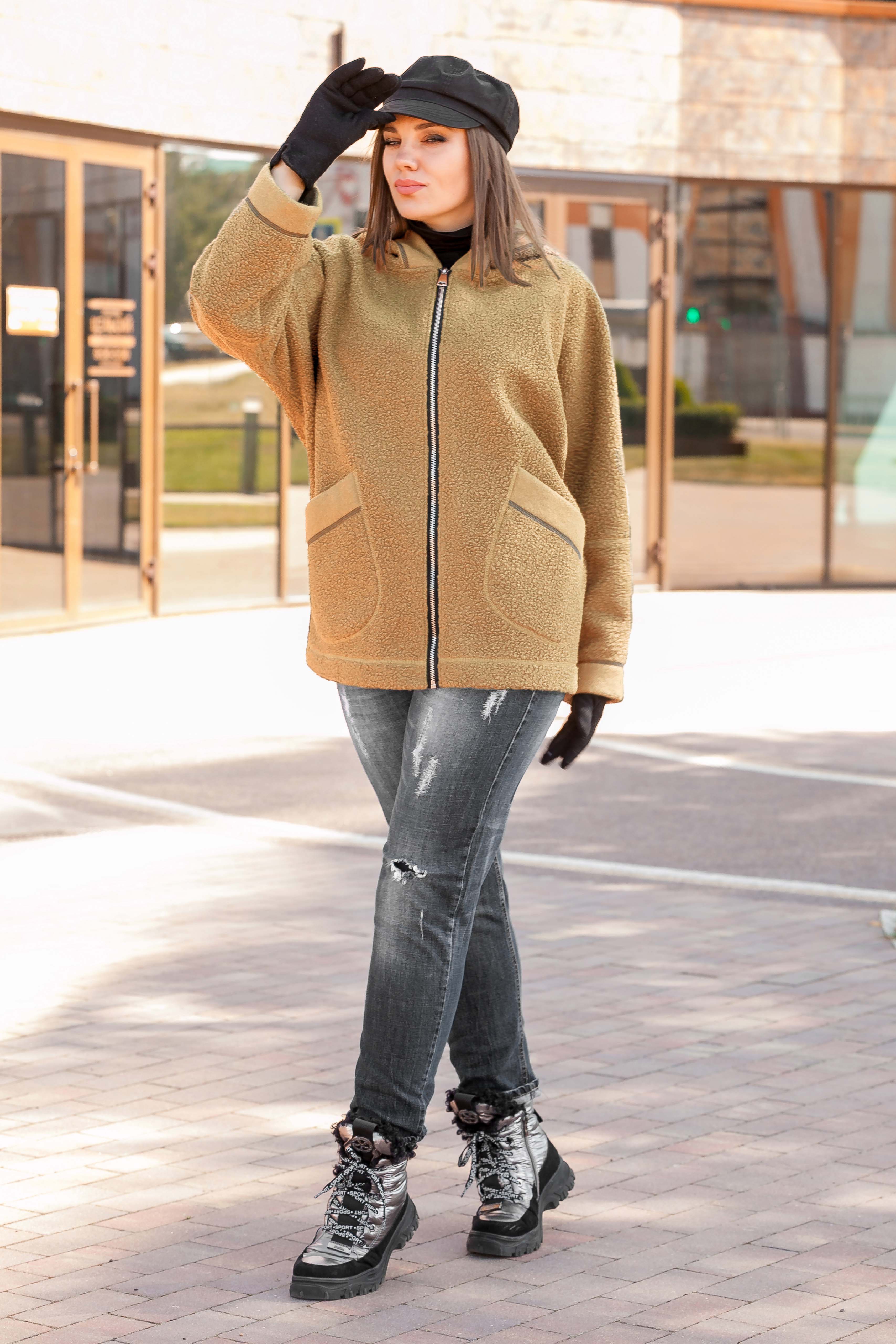 Жакет удлиненный, курточного типа из буклированного полотна “Барашек”, без подкладки на молнии с капюшоном, рукав втачной на спущенной пройме. По полочкам накладные карманы, застежка молния.