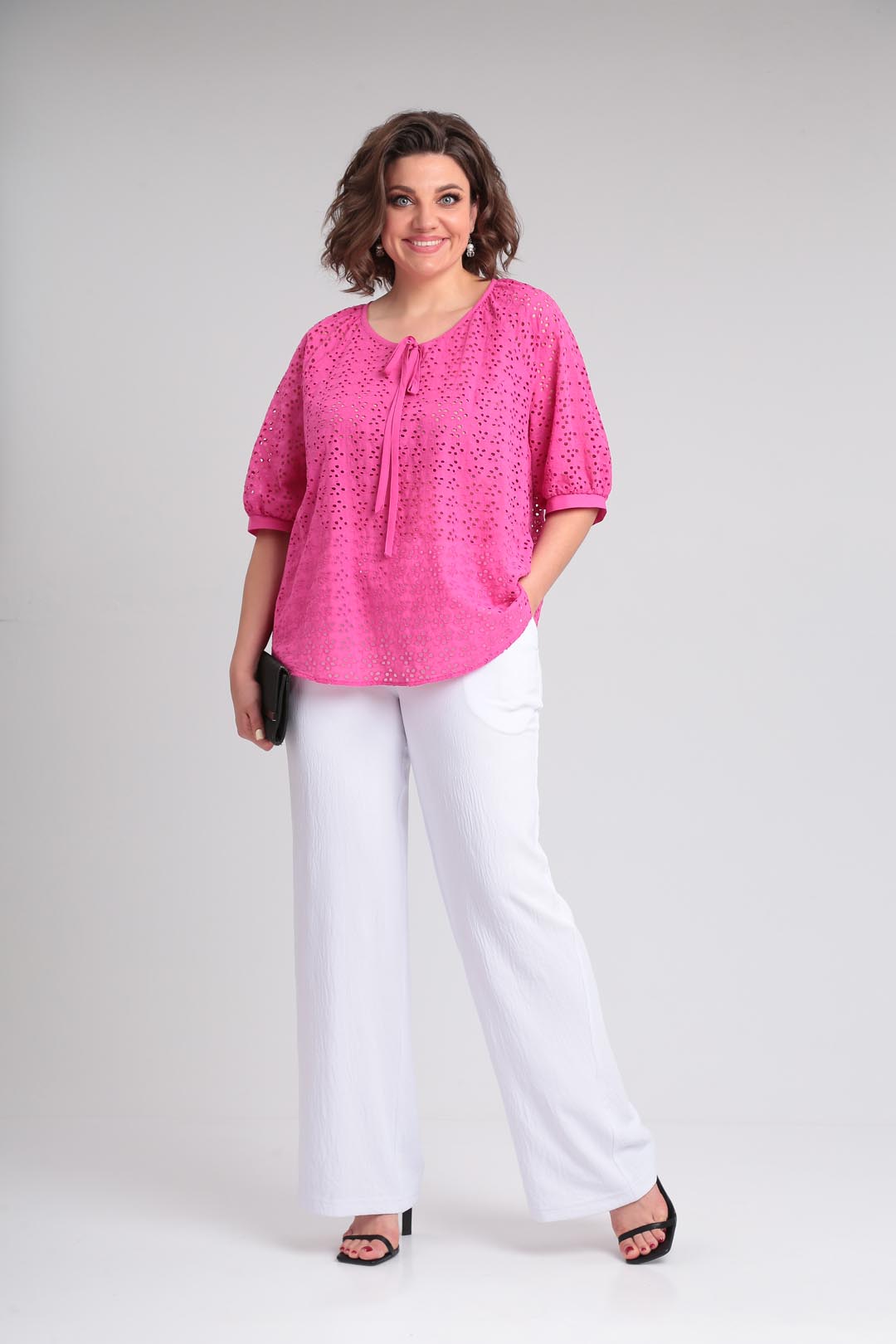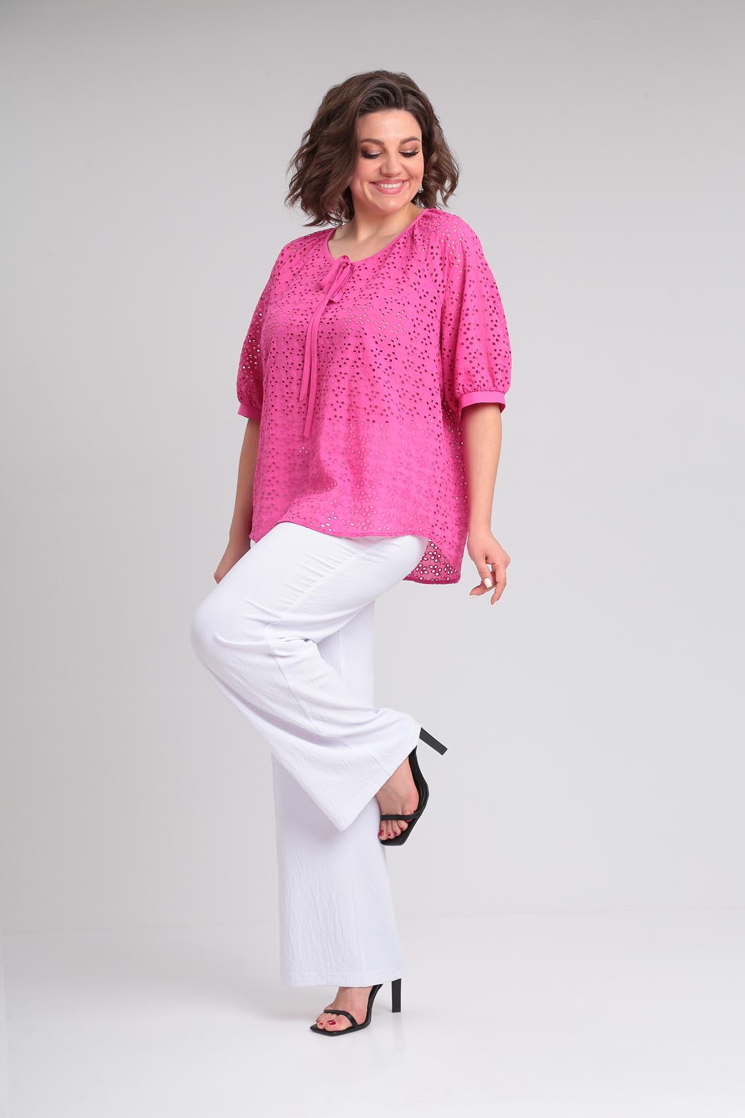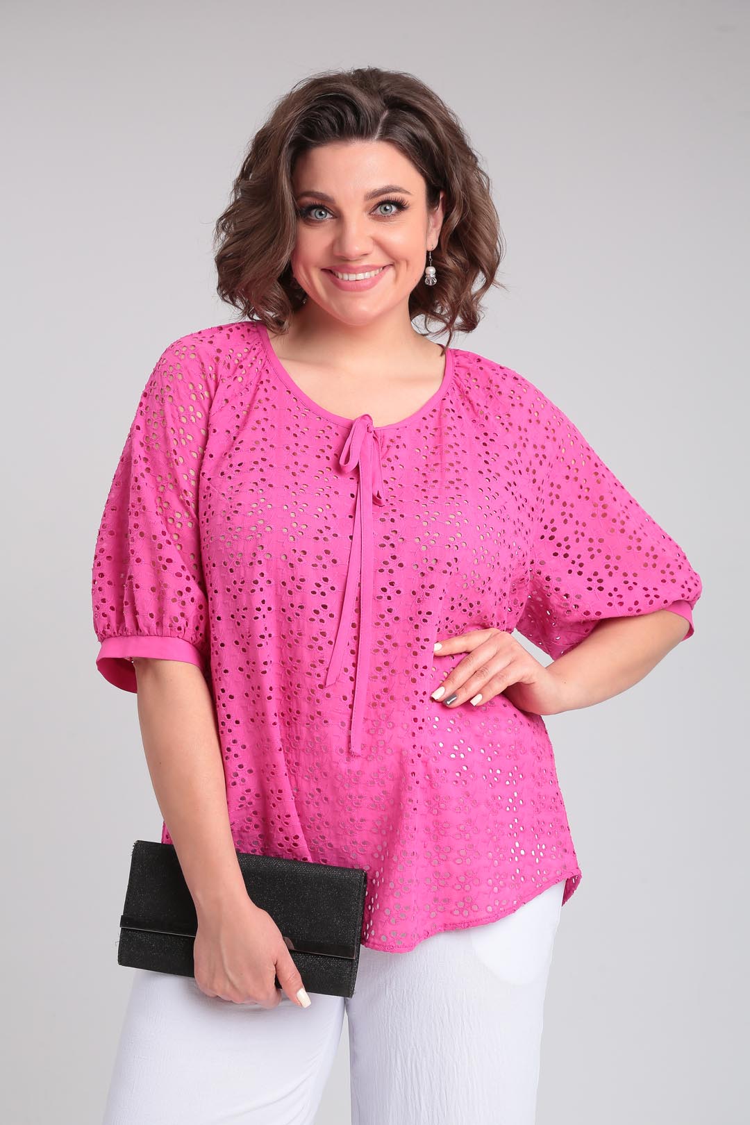 Летняя легкая блузка свободного силуэта,выполненная из хлопкового шитья.Рукав покроя реглан, горловина округлой формы со сборкой.На полочке по горловине сделана капелька на завязке,горловина окантована.Низ фигурный .Низ рукава на сборке и манжете. Длина по спинке 70 см, длина рукава от горловины-45см.