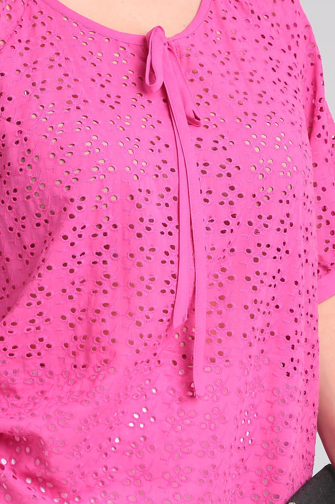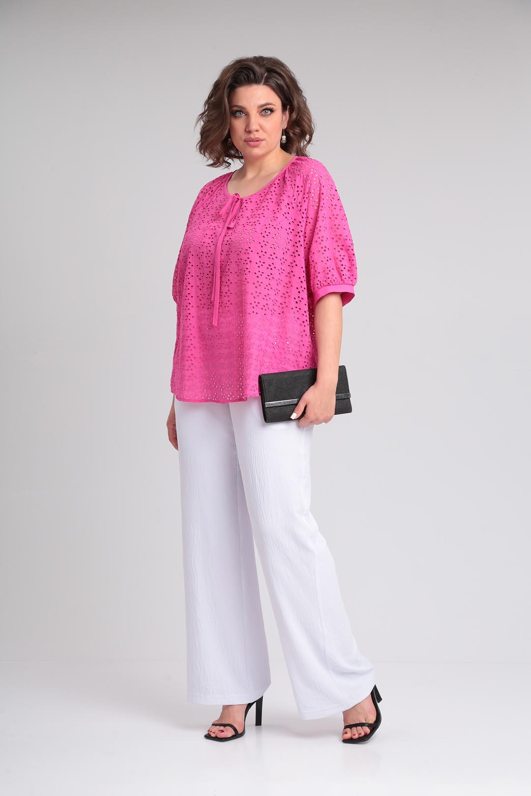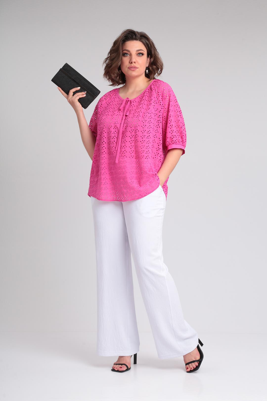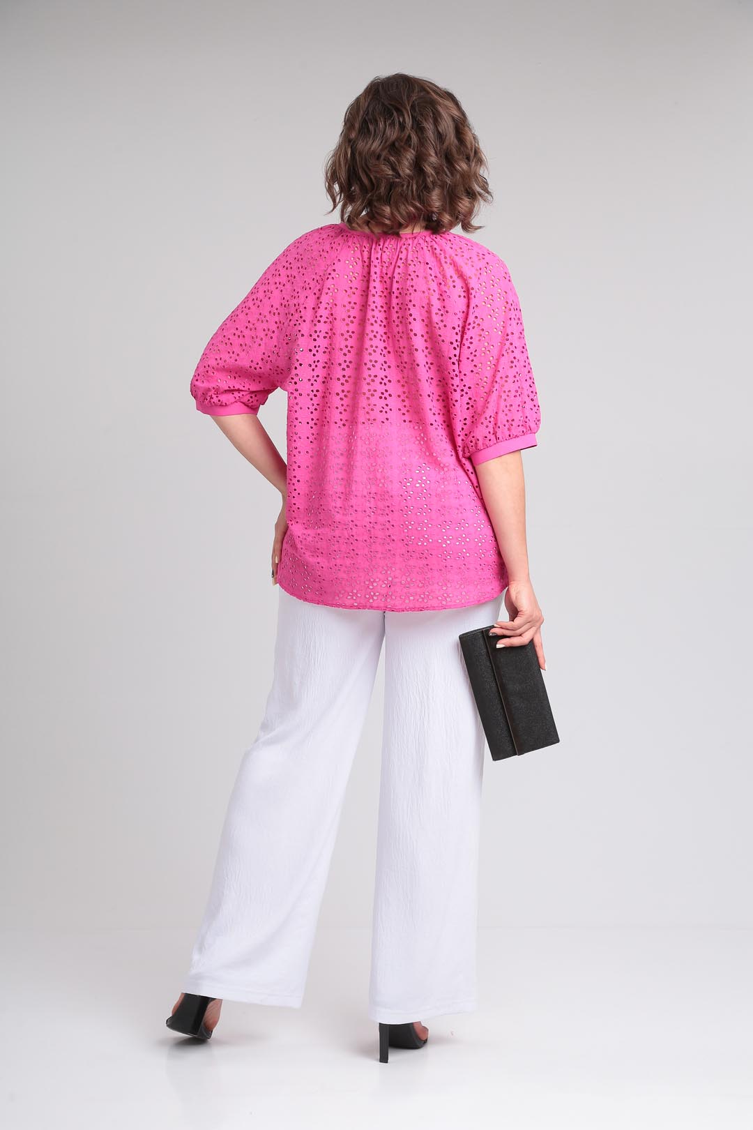 Летняя легкая блузка свободного силуэта,выполненная из хлопкового шитья.Рукав покроя реглан, горловина округлой формы со сборкой.На полочке по горловине сделана капелька на завязке,горловина окантована.Низ фигурный .Низ рукава на сборке и манжете. Длина по спинке 70 см, длина рукава от горловины-45см.