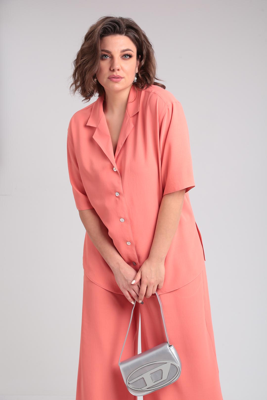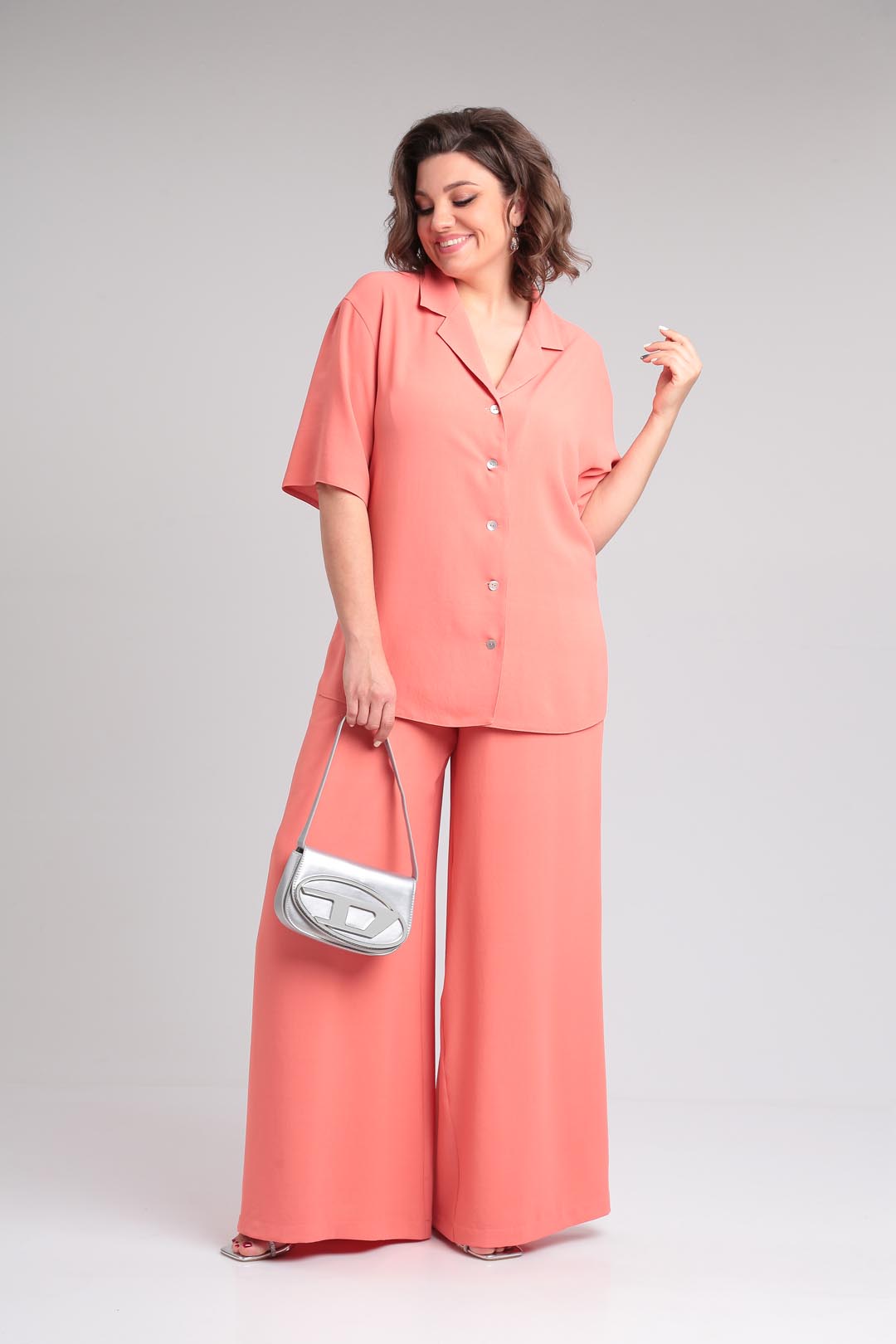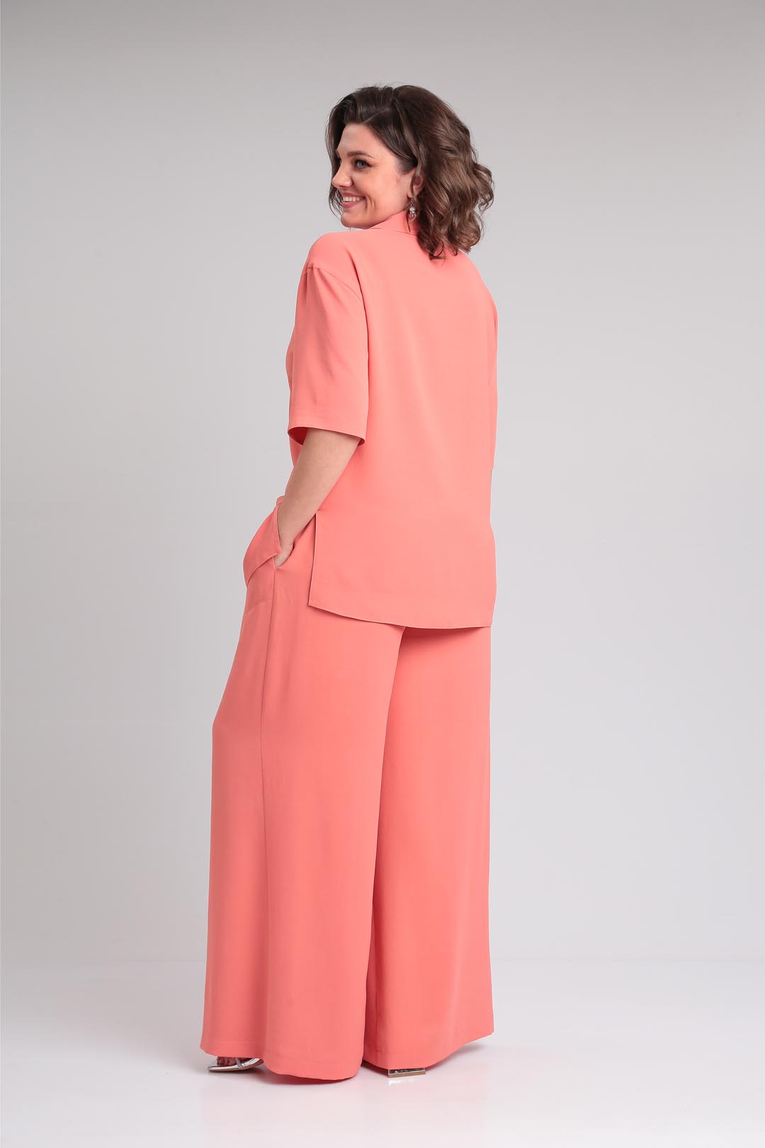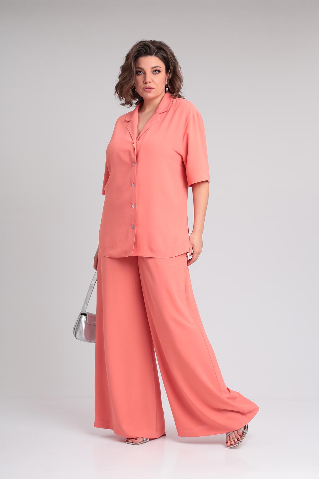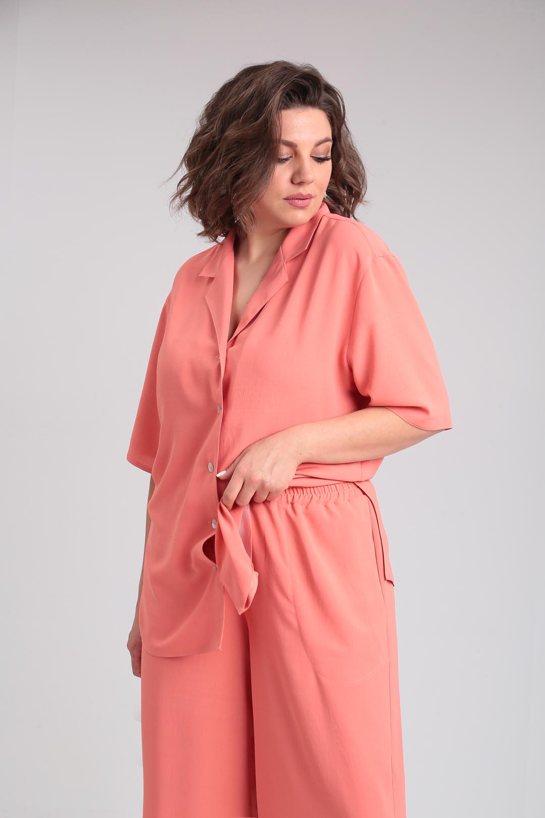 Летний костюм оверсайз из летней ткани в пижамном стиле. Блузон с отложным воротником и лацканом. Рукав втачной, короткий, на спущенной пройме. В боковых швах блузона разрезы. Застежка петли-пуговицы. Брюки палаццо с высокой посадкой на эластичной резинке по талии и карманами в боковых швах. Длина блузки 73 см, рукав от горловины 48 см. Длина брюк 112 см.