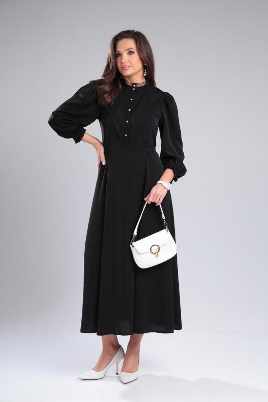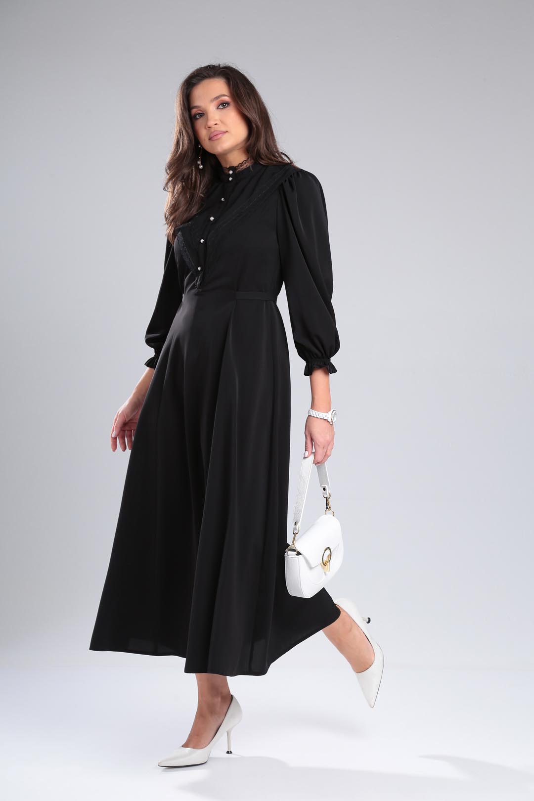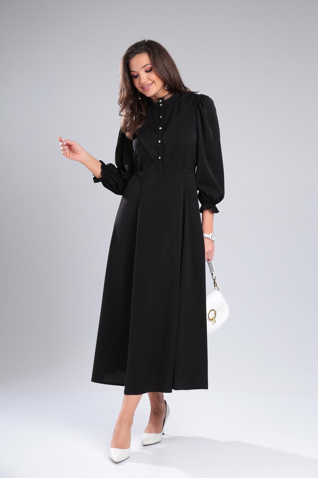 Изысканное платье из легкой летней ткани с множеством декоративных элементов(стойка-воротник с кружевом, отлетная фигурная кокетка по полочке и спинке, втачная планка с декоративными пуговицами,рельефные швы). Платье отрезное по линии талии, расширенное к низу. Рукав втачной, со сборкой по плечу, низ рукава присобран на эластичную ленту. длина по спинке-133см длина рукава-56см