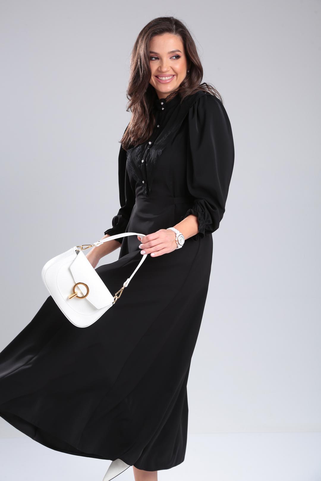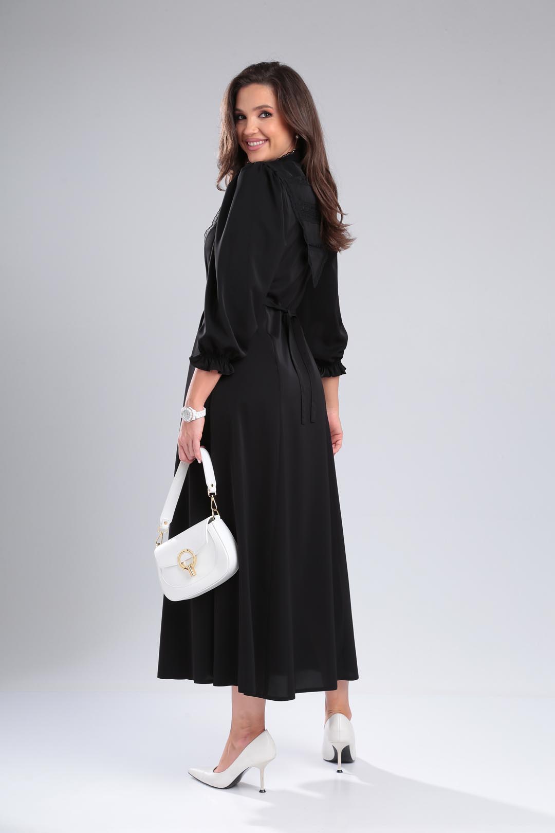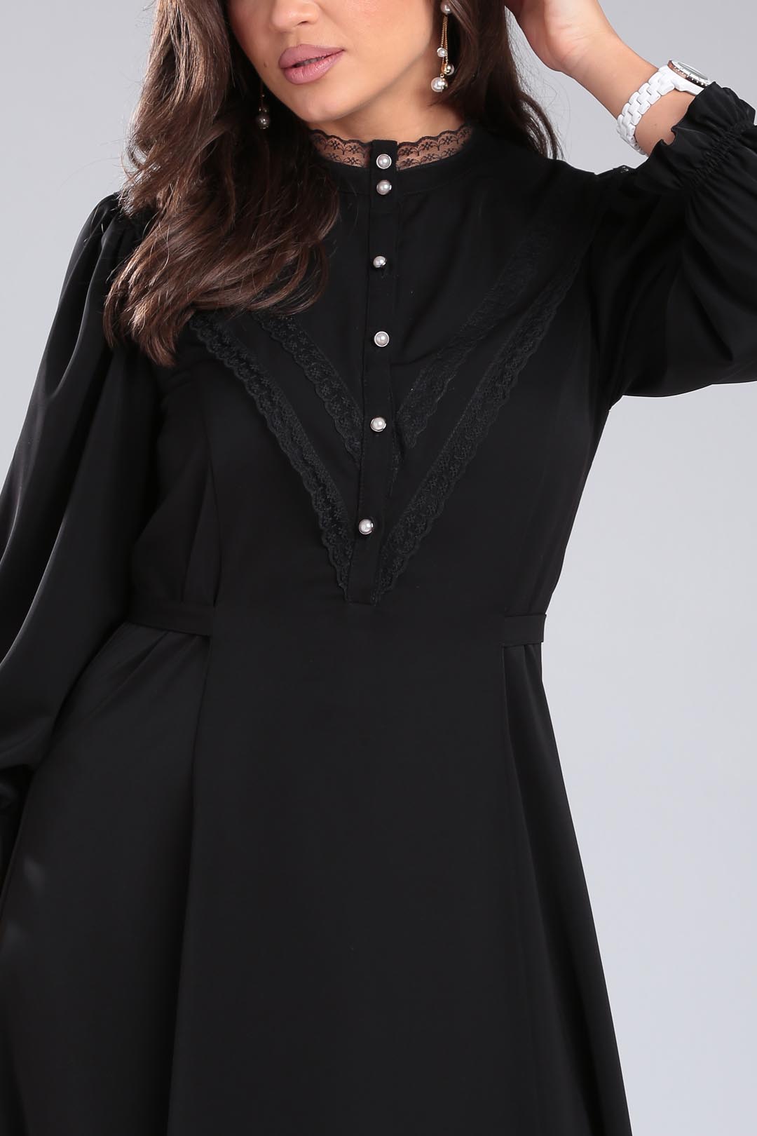 Изысканное платье из легкой летней ткани с множеством декоративных элементов(стойка-воротник с кружевом, отлетная фигурная кокетка по полочке и спинке, втачная планка с декоративными пуговицами,рельефные швы). Платье отрезное по линии талии, расширенное к низу. Рукав втачной, со сборкой по плечу, низ рукава присобран на эластичную ленту. длина по спинке-133см длина рукава-56см