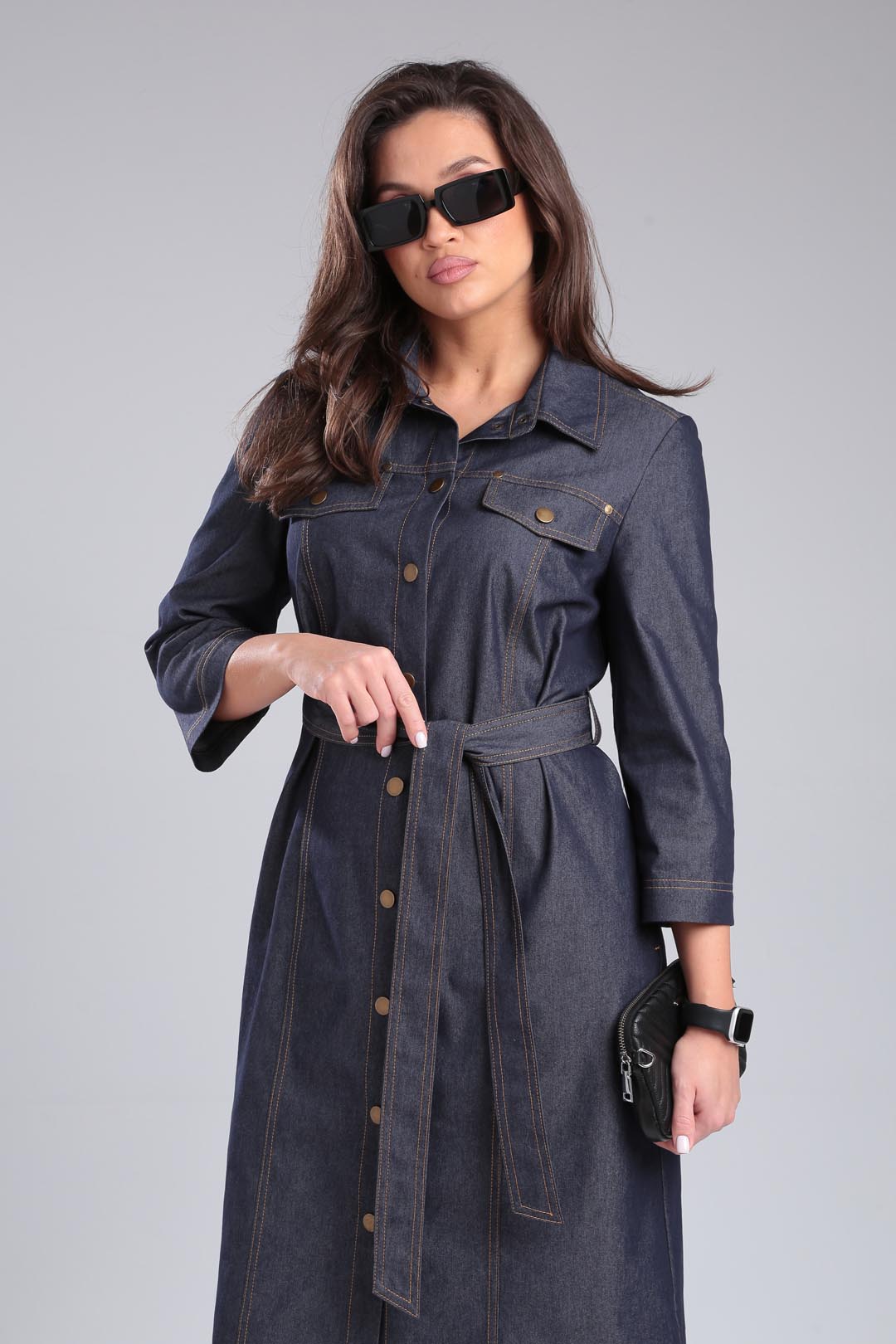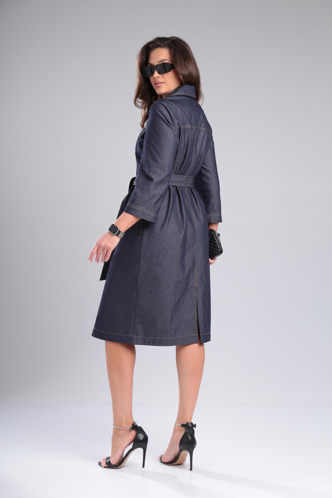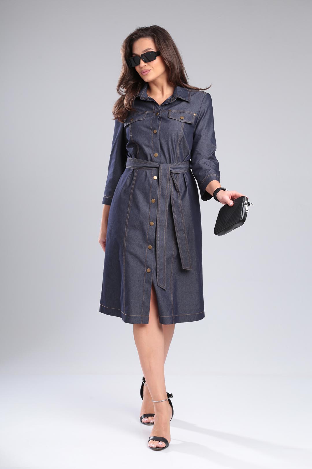 Джинсовое платье под пояс свободного силуэта, рубашечного типа с двойной отстрочкой. Рукав втачной 3/4, воротник на стойке, по полочке рельефы и какетке с клапанами. Спинка со средним швом и разрезом. Застежка на кнопки. Длина 104 см, рукав 48 см.