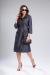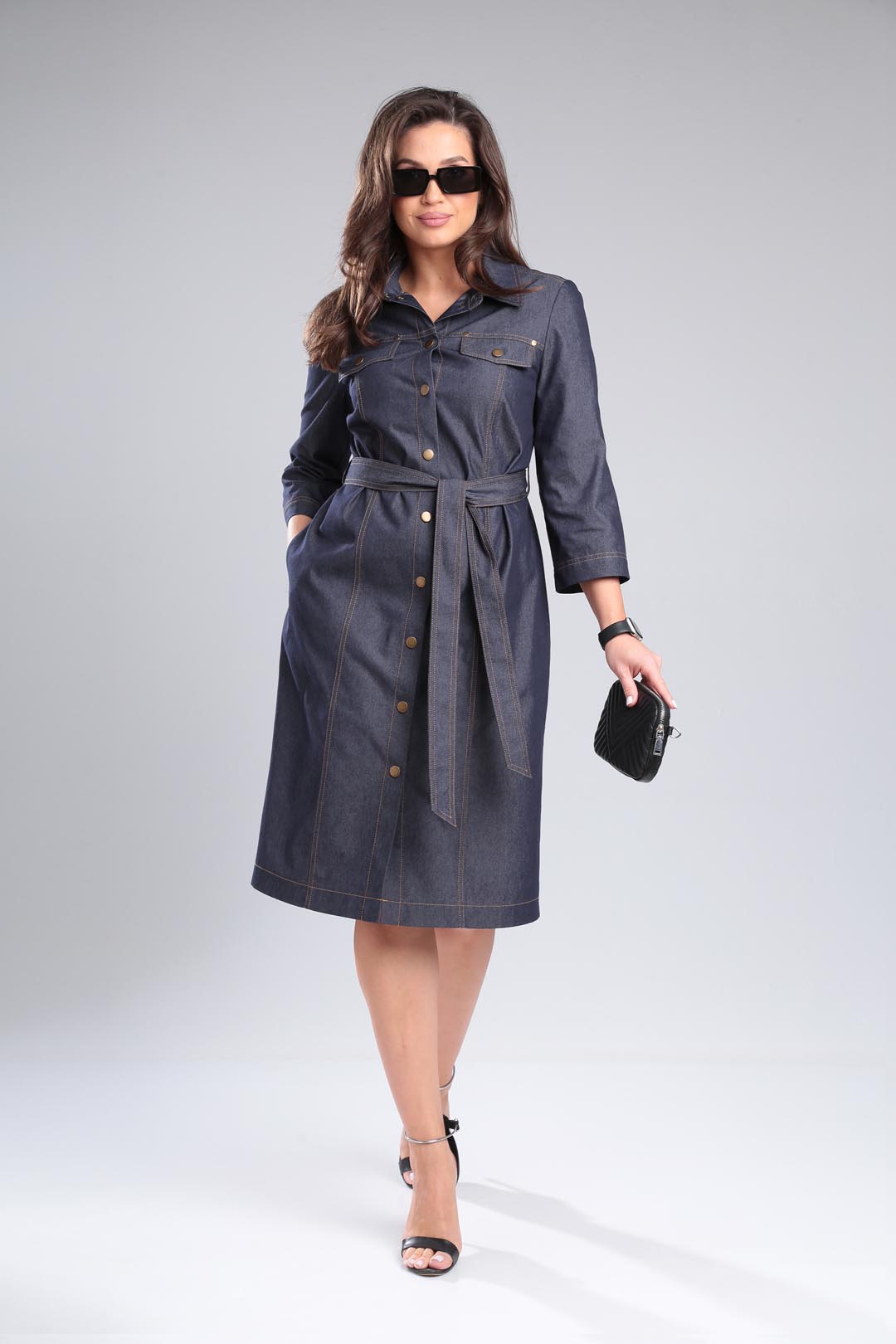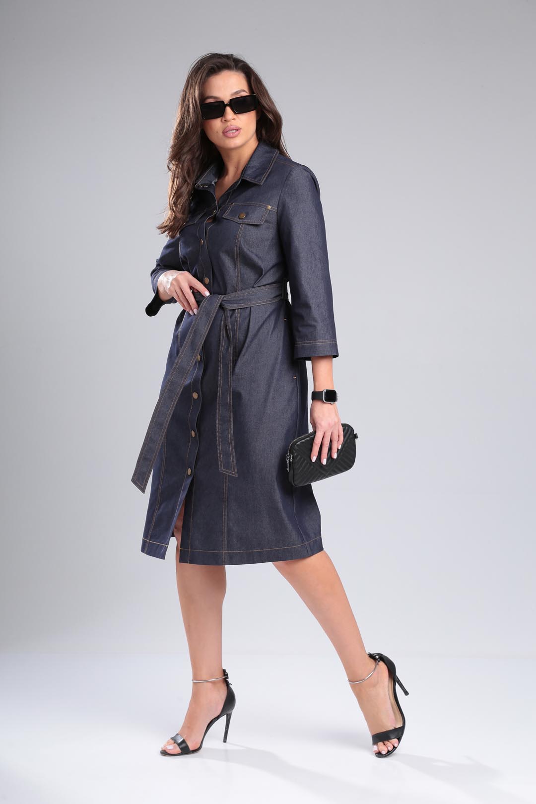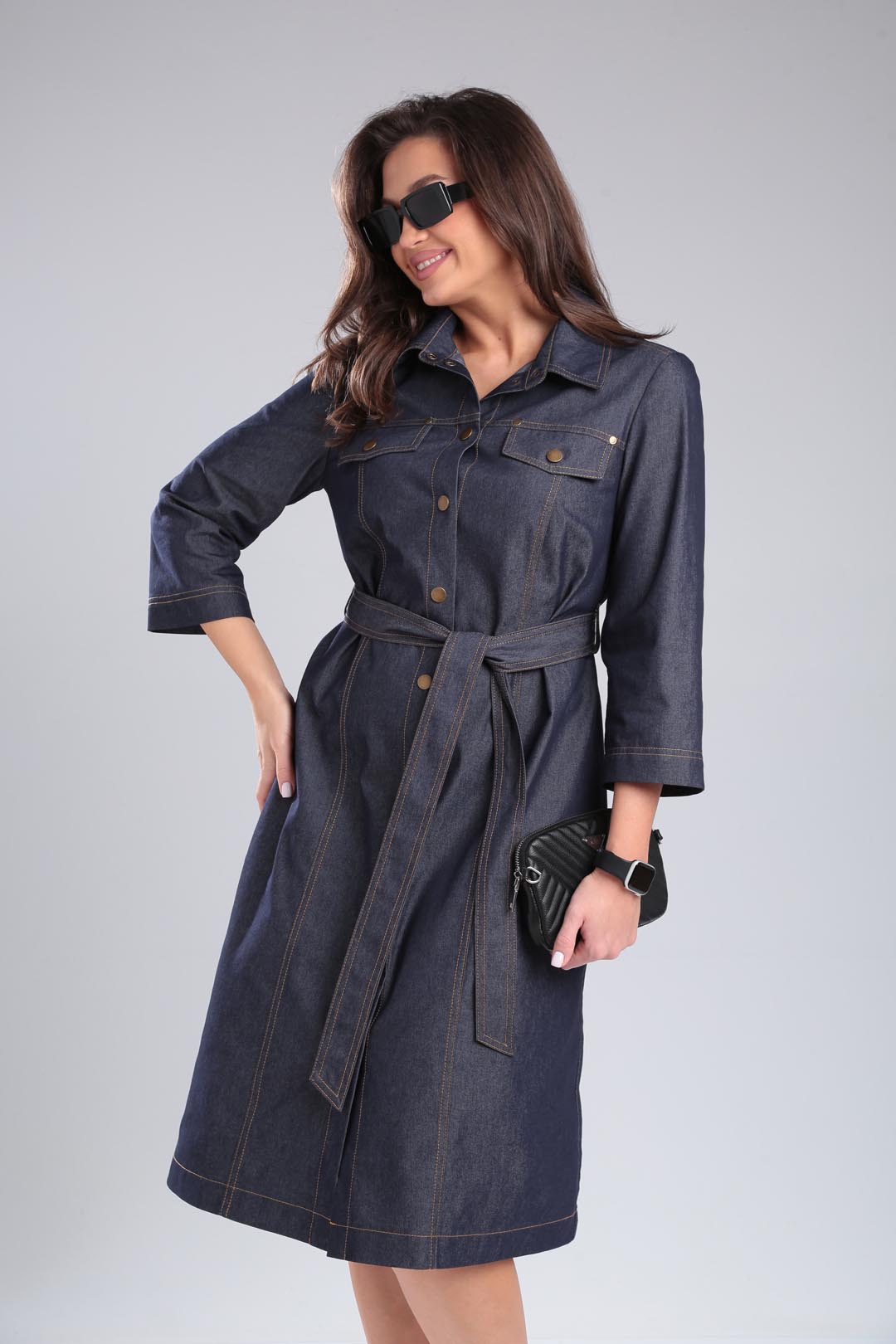 Джинсовое платье под пояс свободного силуэта, рубашечного типа с двойной отстрочкой. Рукав втачной 3/4, воротник на стойке, по полочке рельефы и какетке с клапанами. Спинка со средним швом и разрезом. Застежка на кнопки. Длина 104 см, рукав 48 см.