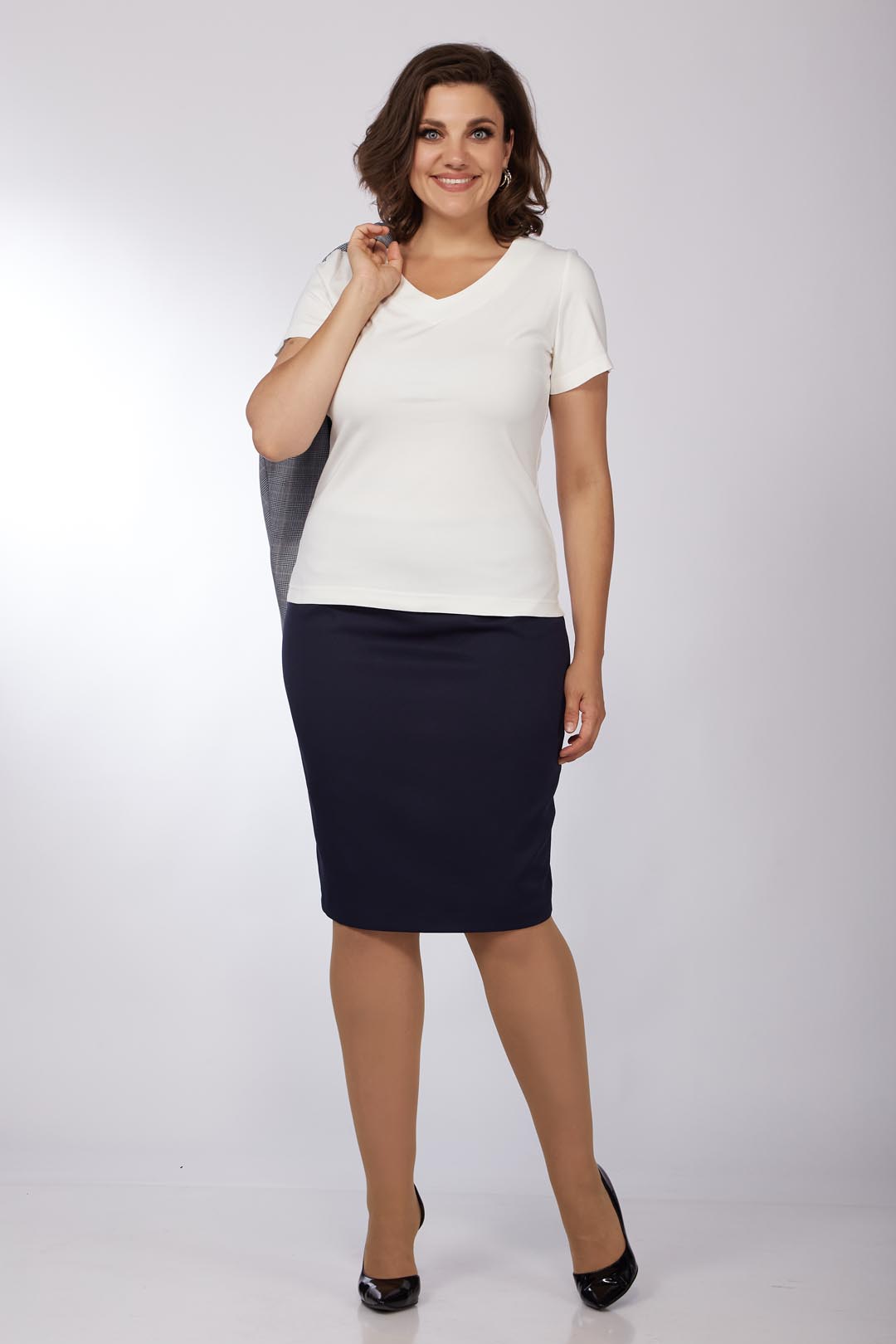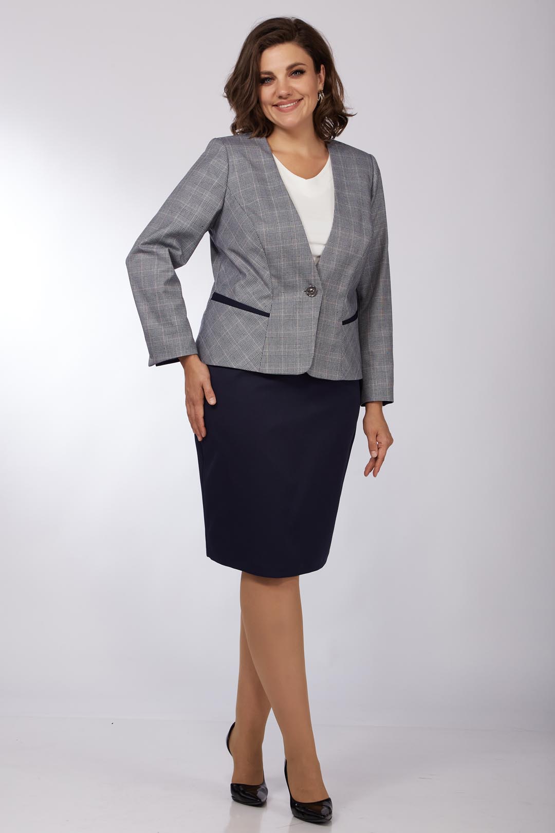 Элегантный дизайн костюма с жакетом подарит комфорт и уверенность в себе. Выполненный из комфортной костюмной ткани. Жакет приталенного силуэта длиной до линии бедер, с застежкой на одну пуговицу на линии талии. Горловина глубокая V-образная, край борта по низу закругленный. Полочки декорированы листочками из отделочной ткани. Рукав три четверти с разрезами в локтевом шве. Низ рукава обработан обтачкой из отделочной ткани, позволяющей отвернуть рукав в виде манжета. На подкладке. Юбка-карандаш на поясе-обтачке. Сзади застежка-молния и разрез по низу юбки. На подкладке. Топ из стрейчевой ткани с рукавом. Горловина V-образная обработанная планкой. Состав жакета: Полиэстер 100%. Длина жакета 55 см, рукав 57 см, длина юбки 60 см, длина майки 60 см.